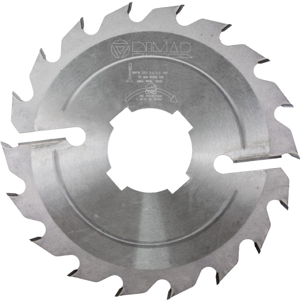 Дисковые пилы MFM с подрезателями для продольного пиления сырой и сухой древесины. Подрезатели, специальные ножи на корпусе пилы, для предотвращения заклинивания корпуса пилы в заготовке, особенно из сырой древесины. Дополнительно подрезатели подчищают торец заготовки, удаляя с него следы от основных зубьев. Прямая форма заточки и большая высота зубьев - для чистого пиления вдоль волокон. Можно использовать как отдельную пилу так и в поставе пил - как центральные пилы.