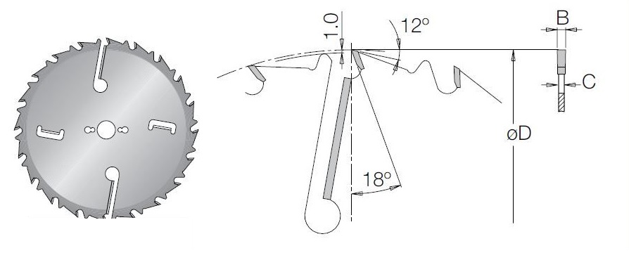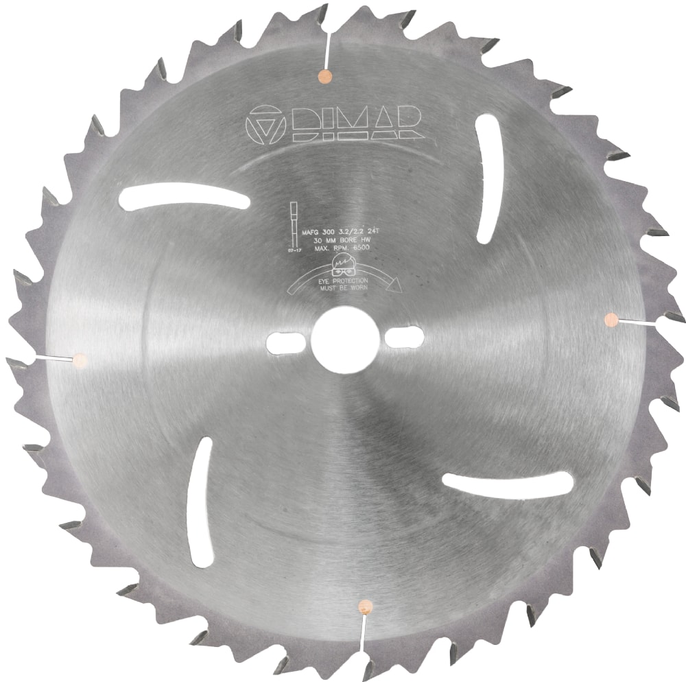 Дисковые пилы MFGМ с ограничителем подачи и подрезателями для продольного пиления сырой и сухой древесины. Подрезатели, специальные ножи на корпусе пилы, для предотвращения заклинивания корпуса пилы в заготовке, особенно из сырой древесины. Дополнительно подрезатели подчищают торец заготовки, удаляя с него следы от основных зубьев. Ограничитель подачи делает работу безопасной и качественной. Он точно дозирует скорость подачи, не позволяя перегружать пилу, исключает выброс заготовки на оператора. Прямоугольная форма заточки и большая высота зубьев - для чистого пиления вдоль волокон.