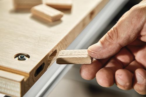Деревянный дюбель с расширяющимися пазами и боковыми канавками для точной посадки. 100% не проворачивается после установки уже первого шипа DOMINO. Длина 36 мм, идеально подходит для соединения двух днищ шкафа со средней стенкой толщиной 19 мм