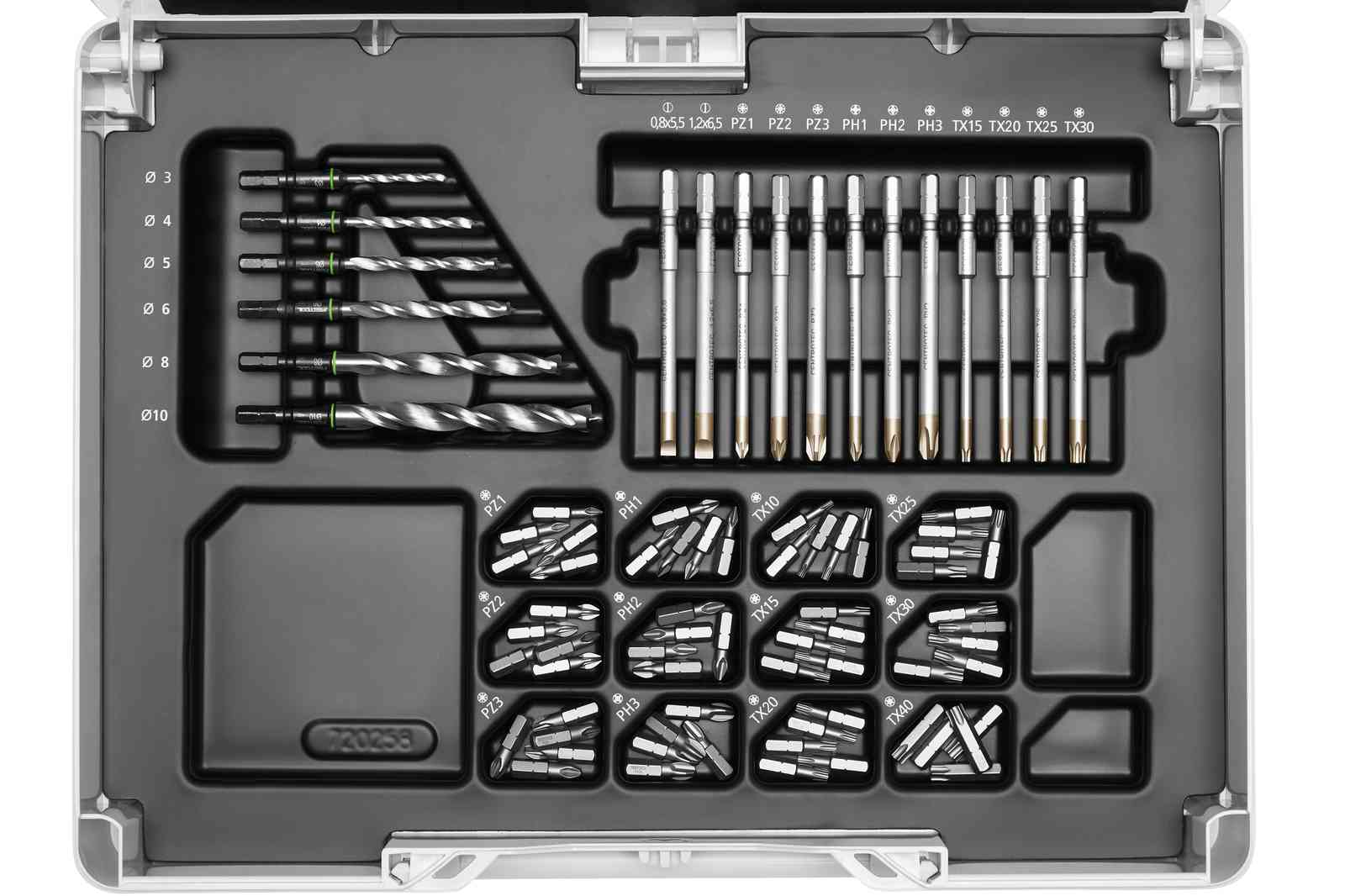 • Помимо разл. бит и свёрл в комплект также входит центрирующее сверло CENTROTEC, сверло-зенкер с огранич. глубины и мн. др
