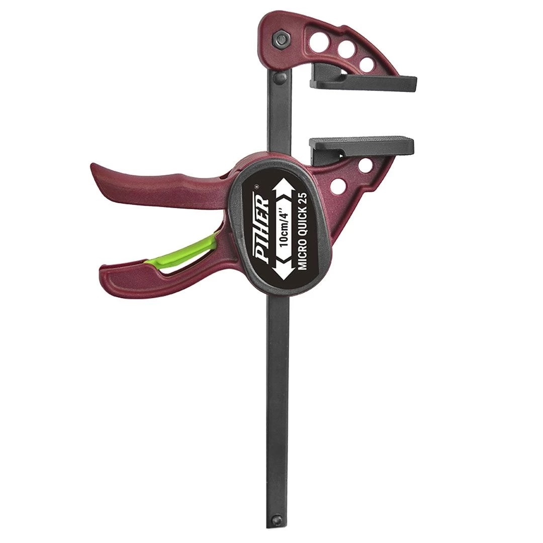 Небольшие быстрозажимные струбцины для работы одной рукой. Губки и рукояти из прочного пластика. Стальная шина со специальным профилем. Мощный стальной механизм. Быстрое разжатие с помощью удобной кнопки. Может работать как распорка, для чего нужно переставить губки. Глубина зажима 4,0см. Создаваемое усилие 250 Н (25кг). Производство - Piher (Испания).