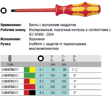 VDE изолированная четырёхгранная отвертка "внутренний квадрат"