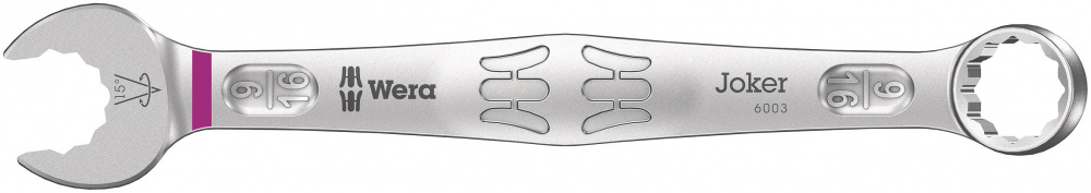 Поскольку завинчивать приходится всё чаще в ограниченном пространстве, то требуются инструменты, которые помогут успешно работать даже в таких условиях. В ограниченном пространстве необходимо изыскивать возможности для манипуляций инструментом. Можно ли изменить гаечный ключ так, чтобы повысить эти возможности для инструмента? Сочетание в рожковой части наклона под углом 7,5° и профиля в виде двойного шестигранника увеличило вдвое возможности для накидывания ключа. При повторных поворотах ключа в процессе завинчивания на 180° относительно продольной оси предусмотрены четыре варианта накидывания ключа, когда гайка или головка винта захватывается через каждые 15°. Joker 6003 благодаря продуманной форме рожковой части значительно расширяет варианты применения в ограниченном пространстве. Можно сказать, Joker 6003 сам находит соответствующее положение после каждого перекидывания. Тонкая и при этом прочная накидная часть изогнута на 15° к оси инструмента. За счёт качественного покрытия обеспечивается надёжная, длительная защита от коррозии. С идентификатором инструментов Take it easy: цветовая кодировка размера.