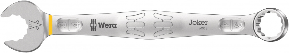 Поскольку завинчивать приходится всё чаще в ограниченном пространстве, то требуются инструменты, которые помогут успешно работать даже в таких условиях. В ограниченном пространстве необходимо изыскивать возможности для манипуляций инструментом. Можно ли изменить гаечный ключ так, чтобы повысить эти возможности для инструмента? Сочетание в рожковой части наклона под углом 7,5° и профиля в виде двойного шестигранника увеличило вдвое возможности для накидывания ключа. При повторных поворотах ключа в процессе завинчивания на 180° относительно продольной оси предусмотрены четыре варианта накидывания ключа, когда гайка или головка винта захватывается через каждые 15°. Joker 6003 благодаря продуманной форме рожковой части значительно расширяет варианты применения в ограниченном пространстве. Можно сказать, Joker 6003 сам находит соответствующее положение после каждого перекидывания. Тонкая и при этом прочная накидная часть изогнута на 15° к оси инструмента. За счёт качественного покрытия обеспечивается надёжная, длительная защита от коррозии. С идентификатором инструментов Take it easy: цветовая кодировка размера.