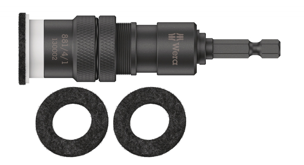 При возведении террасы крепеж должен быть утоплен в досках заподлицо. Битодержатель 881/4/1 с изменяемой глубиной завинчивания и войлочной прокладкой обеспечивает утапливание крепежа на одинаковую глубину и защищает рабочие поверхности от следов завинчивания. 2 запасных войлочных прокладки прилагаются.