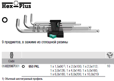 9 Г-образных ключей с размерами: 1,5 мм (длина 90 мм), 2 мм ( длина 100 мм), 2,5 мм ( длина 112 мм), 3 мм (длина 126 мм), 4 мм (длина 140 мм), 5 мм (длина 160 мм), 6 мм (длина 180 мм), 8 мм (длина 200 мм), 10 мм (длина 219 мм). Поставляется в резиновом зажиме.