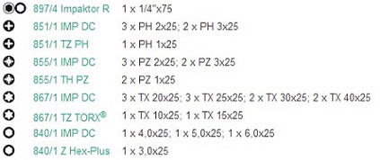 | 1 ударный держатель с пружинным стопорным кольцом и кольцевым магнитом, 23 ударных насадок и 6 стандартных торсионных насадок. ударная система благодаря наилучшему использованию свойств материала и оптимально подобранной геометрии обеспечивает значительно более длительный срок службы даже в достаточно жестких условиях; особенно подходит для использования с обычными ударными гайковертами; держатель с кольцевым магнитом для простоты фиксации длинных и тяжелых винтов, идеальны также для работ, проводимых над головой. Шероховатое алмазное покрытие за счет повышенного сопротивления трения уменьшает опасность выскальзывания инструмента из винта |
