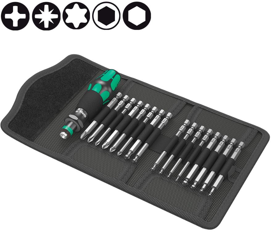 Складная сумка с битами длиной 89 мм. Набор включает динамометрическую отвёртку 7441 с быстрозажимным патроном „Rapidaptor" и многокомпонентной ручкой Kraftform для малоутомительной работы. Подходит для завинчиваний в ручном и машинном режимах. 17 предметов. Компактная система "Одна ручка – много насадок" для завинчиваний с контролем момента затяжки. Набор включает динамометрическую ручку-держатель 7441, диапазон значений 1,2 - 3,0 Нм. Установка с шагом 0,10 Нм. Простая установка необходимого значения без специального инструмента. Хорошо читаемая шкала. Технология Rapidaptor для моментальной смены битов. Неограниченный момент силы при отвинчивании трудноподдающихся винтов. Многокомпонентная ручка Kraftform с твёрдыми и мягкими зонами для высокой скорости работы и для щадящего контакта с ладонью. Набор включает 16 битов длиной 89 мм. В практичной складной сумке для хорошего обзора и удобного хранения инструментов.